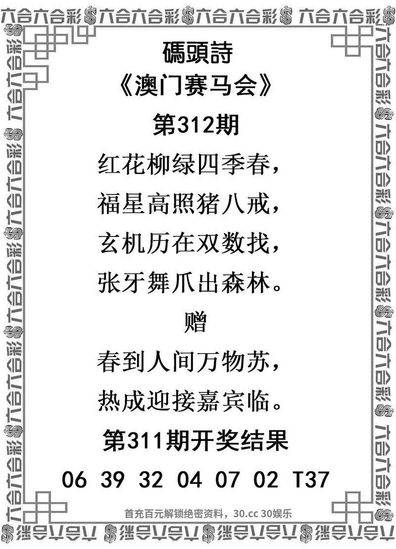 312期解析:红花柳绿四季春,福星高照猪八戒,玄机历在双数找,张牙舞爪出森林。 综合生肖:牛鼠羊马虎龙 |