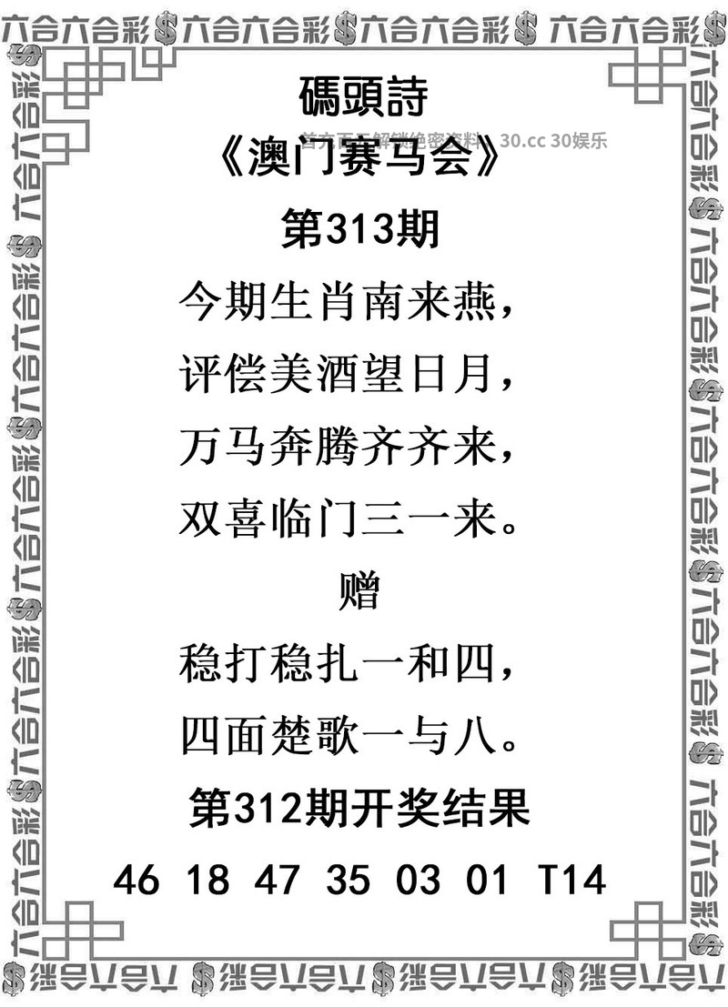 313期解析:今期生肖南来燕,评偿美酒望日月,万马奔腾齐齐来,双喜临门三一来。 综合生肖:马鸡鼠猪龙猴 |