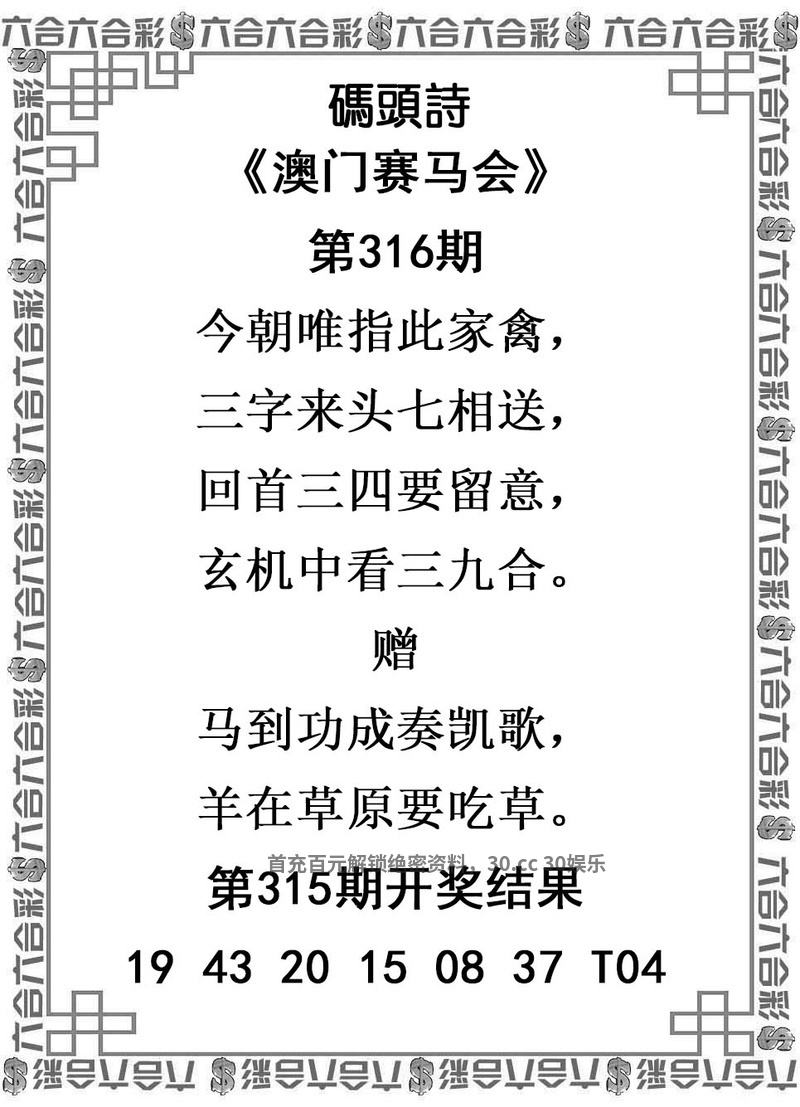 316期解析:今朝唯指此家禽,三字来头七相送,回首三四要留意,玄机中看三九合。 综合生肖:鸡猪马羊狗蛇 必中四肖:鸡猪马羊 |
